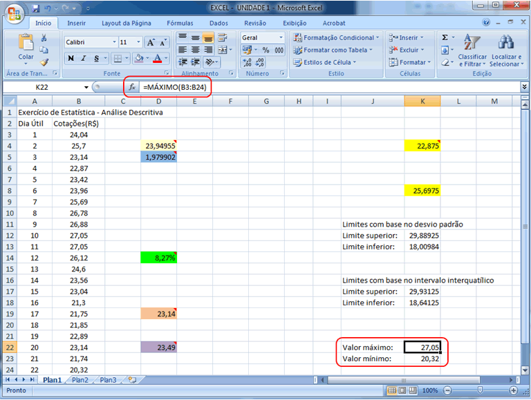 | Por último utilizaremos o Excel para determinar os valores máximo e mínimo do conjunto de observações, o que é particularmente útil quando a base de dados é grande e não é possível visualizá-los com clareza. Isto é feito de forma análoga à média e desvio-padrão, devendo-se selecionar as células, posicionar o cursor, clicar em fx, Estatística, MÁXIMO ou MÍNIMO, OK, marcar ou digitar a posição da base de dados no campo ao lado de Num1 e OK. Veja na planilha abaixo os resultados nas células K22 e K23.