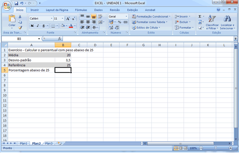 | 3 - Usando o Excel A utilização da planilha Microsoft Excel, nos dois casos trabalhados neste módulo, também permitiria obtenção dos resultados solicitados. No caso do primeiro exercício, é interesse o percentual de casos acima de 25 kg em uma distribuição normal cuja média é 20 kg e desvio-padrão 3,5 kg. Abrindo-se uma planilha Excel, pode-se digitar estas referências para, em seguida, utilizar a ferramenta adequada.