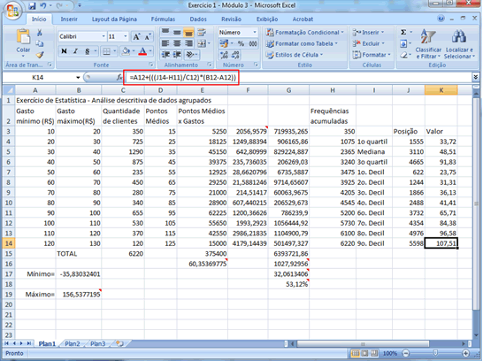 | A determinação dos decis obedece a mesma sequência dos quartis (lembrando que o quinto decil, sendo a própria mediana, já está determinado). Assim, nas células de J7 a J15 estarão as posições dessas separatrizes (=0,1*C15, = 0,2*C15, =0,3*C15 e assim sucessivamente) e, em seguida, nas células de K7 a K15 os valores correspondentes aos oito decis ainda não conhecidos (lembrando a formulação especificada já demonstrada).