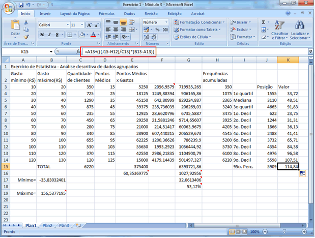 | Para qualquer percentil não há novidade, devendo o procedimento ser análogo ao que foi feito para quartis e decis (lembrando que todas essas medidas já calculadas são percentis). Apenas para concluir, será apresentado o cálculo do 95º percentil nas células J15 e K15.