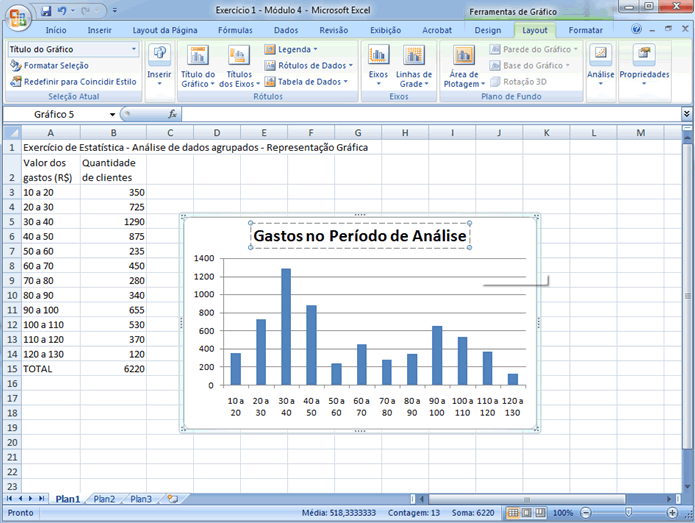 Na caixa de texto “Título do Gráfico” exibida no gráfico, digite o título "Gastos no Período de Análise". Para formatar o texto, selecione-o e clique nas opções de formatação desejadas na Minibarra de ferramentas. Dica: você também pode usar os botões de formatação da Faixa de Opções (guia Início, grupo Fonte). Para formatar o título inteiro, clique nele com o botão direito, clique em Formatar Título de Gráfico e selecione as opções de formatação desejadas.