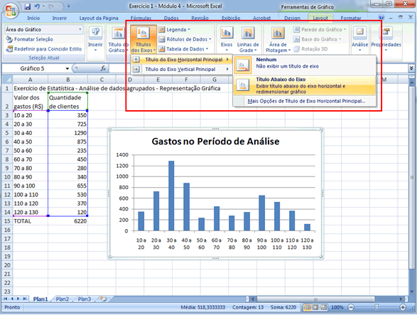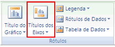 | Adicionando os títulos nos eixos Vamos agora adicionar os títulos dos eixos. Na guia Layout, no grupo Rótulos, clique em Títulos dos Eixos.