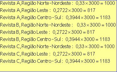 | Essa tabela parece revelar algum grau de dependência/relacionamento entre as variáveis região de residência do leitor e preferência por revista semanal de circulação nacional, uma vez que, se não houvesse, seriam esperadas proporções próximas a 33,33%; 27,22% e 39,44% em cada uma das regiões (de tal modo que não seria possível a identificação da região, caso fosse dado o perfil de preferência, ou, em outras palavras, para todas as regiões valeria o padrão de preferência revelado para o Brasil como um todo). Dito de outra forma, se a distribuição de preferência considerando todas as regiões é 33,33%; 27,22% e 39,44%, então caso a preferência fosse independente da região, encontraríamos essa mesma proporção em todas as regiões. Por exemplo, para a revista A na região Norte-Nordeste, teríamos 33,33% do total da região, ou seja, 33,33% * 3000 = 1000. Para a revista B teríamos 27,22% do total, nesse caso 27,22%*3000 = 817 e, por fim, para a revista C teríamos 39,44% * 3000 = 1183. Assim, as respectivas frequências hipotéticas para essa situação (de independência) seriam: