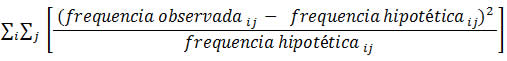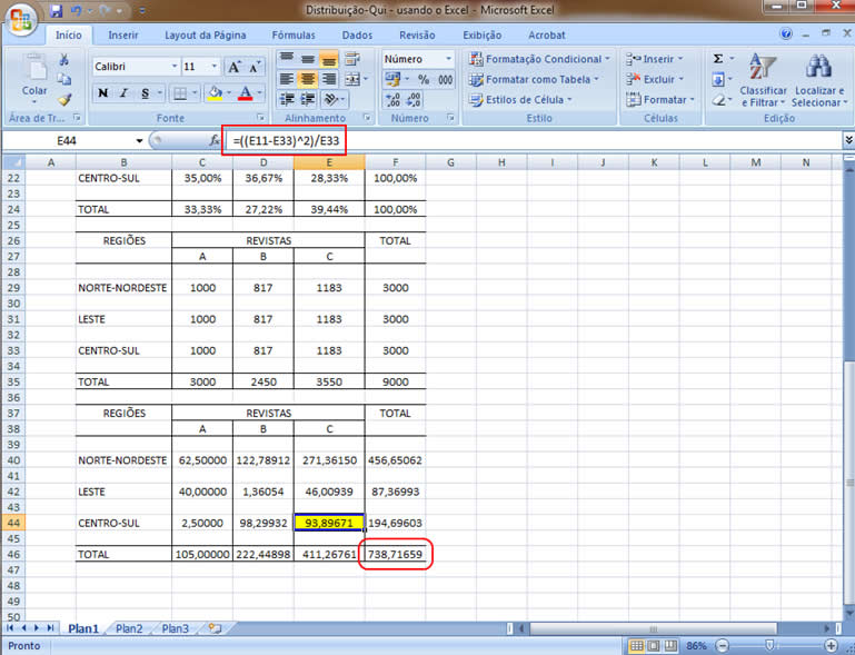 | Deve-se agora construir uma tabela na qual apareçam as parcelas que totalizarão o qui-quadrado calculado. Para o cruzamento revista A e região Norte-Nordeste, lembrando que a medida geral é dada por