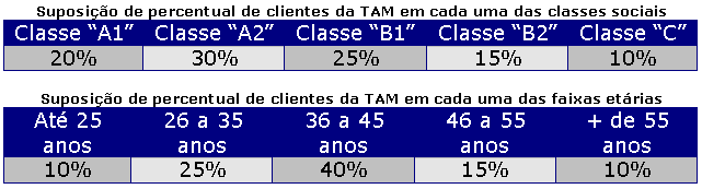 Se a TAM fosse fazer uma pesquisa com 200 clientes e optasse por utilizar a amostragem estratificada proporcional, o tamanho de cada estrato da amostra seria proporcional ao tamanho de cada estrato na população (total de clientes). Assim, o número de pesquisados em cada um dos estratos de classe social e de faixa etária seria: