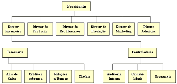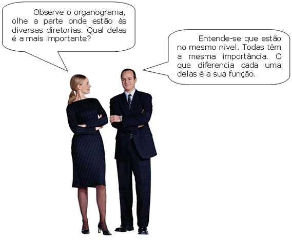 Nos corredores há murais e, num deles, que se localiza próximo à sala de reunião, encontra-se o organograma da empresa. Além da presidência e das diretorias, você, por gostar muito, fixa-se no departamento financeiro.