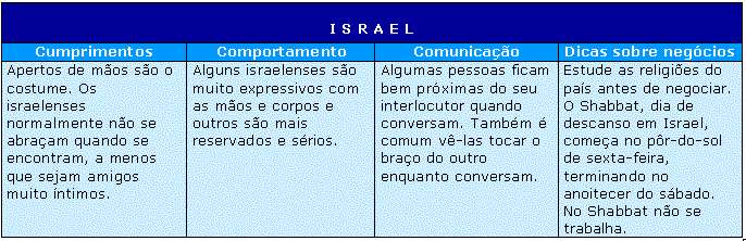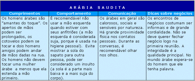 O Oriente Médio e a África têm costumes muito diferentes dos países do Ocidente. Seguem informações sobre a maneira padrão de cumprimento, informações sobre o comportamento e a comunicação e algumas dicas de negociação de quatro países: África do Sul, Arábia Saudita, Irã e Israel.