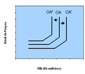 A curva de oferta agregada no painel (b) se desloca com mudanças na disponibilidade de recursos. Mais recursos disponíveis produzem um deslocamento da curva de OA para a direita.