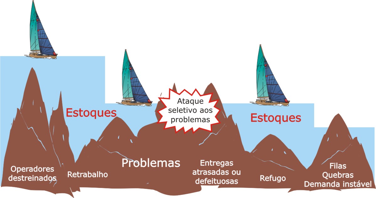 a. O papel dos estoques - Na abordagem tradicional os estoques são considerados úteis por proteger o sistema produtivo de problemas que podem causar a interrupção do fluxo de produção (por exemplo, falta de peças e atrasos de fornecedores, entre outros).