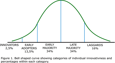 Rogers identificou o padrão que geralmente ocorre na disseminação tecnológica. Este padrão classifica os usuários que adotam produto em categorias, em função do tempo para adoção, o qual começa com um pequeno número de inovadores (innovators), tomando forma e acelerando até o ponto máximo, quando metade dos inovadores potenciais já está utilizando a inovação. Em seguida, a curva começa a declinar até os poucos e últimos inovadores (leggards). |