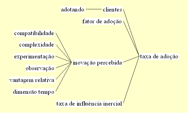 Como se pode observar, a taxa de adoção depende diretamente do número atual de clientes, do fator de adoção, da inovação percebida e da taxa de influência inercial. A inovação percebida, por sua vez, depende de um conjunto de variáveis (compatibilidade, complexidade, vantagem relativa, etc.). b) Para uma análise inversa, deseja-se agora verificar em que a taxa de adoção é utilizada. Para isso seleciona-se esta variável e aciona-se a ferramenta Uses Tree: