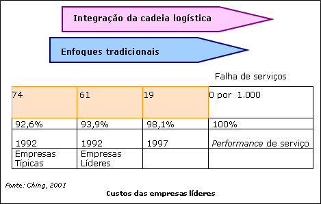 Empresas líderes esperam com o emprego do supply chain, uma redução em seus custos, como é o caso da Motorola que reduziu em 75% sua base de fornecedores (85% de seus fornecedores são preferenciais) e obteve uma economia anual em torno de 7% (Ching, 2001). A figura abaixo mostra que em 1997, com o emprego da gestão da cadeia de suprimento, o desempenho das empresas líderes já apresentavam uma vantagem de 51% sobre as empresas típicas e com um custo logístico sobre as vendas de 5%. Já a figura seguinte, mostra que o salto na qualidade dos serviços prestados pelas empresas líderes que aderiram ao supply chain é de 98, 1%, em 1997.