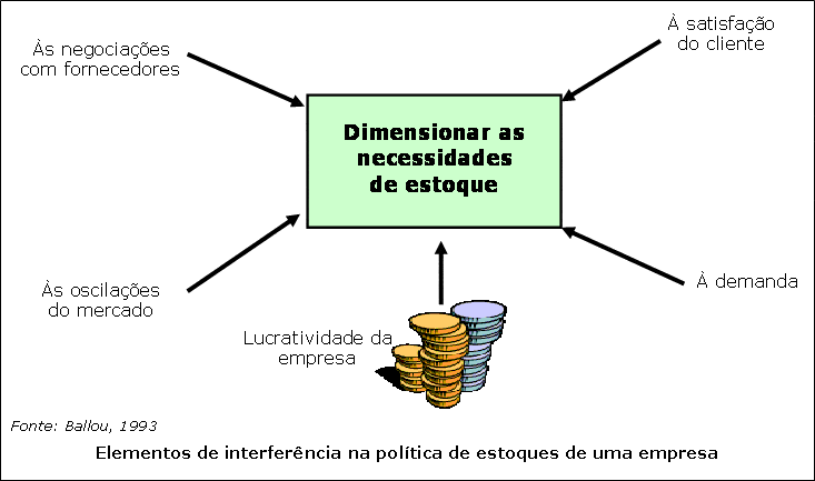 | 3 - Problemática, função e objetivos da administração de estoques Uma das mais relevantes funções da administração de estoques está relacionada ao nível de estoque que se deve manter, ou melhor, ao controle de estoques, que é uma função da necessidade de estipular os diversos níveis de materiais e produtos que a empresa deve manter, dentro de parâmetros econômicos. O problema da administração de estoques está diretamente caracterizado na frase: “dentro de parâmetros econômicos”. Ou seja, é preciso tomar uma decisão acerca das quantidades dos materiais e produtos a serem mantidos em estoques, bem como em relação aos custos associados tanto ao processo produtivo quanto à estocagem. Portanto, a problemática é: “por um lado manter um volume de materiais e produtos em estoque que atenda à demanda do mercado, assim como suas variações e, por outro, minimizar os investimentos nesse setor.” Estabelecer os níveis de estoque é apenas uma parte do problema do controle de estoque. Logo, o dimensionamento das necessidades de estoque, como mostra a figura abaixo, deve ter como principal base uma política que atenda: