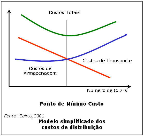 Sabe-se que o custo de transporte, na maioria das empresas, absorve entre um e dois terços do total dos custos logísticos (Ballou, 2001) e também que, independentemente do ramo de negócios da empresa, da localização de suas instalações e dos mercados consumidores, ele sempre é realizado (ou por meios próprios, ou por terceiros). A seguir, apresenta um modelo simplificado do custo de distribuição, onde observamos que o comportamento de Custo de Transporte é inverso ao do Custo de Armazenagem, ou seja, a medida que um cresce o outro diminui. Pois se eu minimizo meu estoque disponível (diminuo o custo de armazenagem) e tenho que atender a minha demanda prontamente por meio da reposição do estoque um maior número de vezes (aumento o número de movimentação e, portanto, o custo de transporte aumenta).