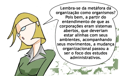 A maioria das metáforas que vimos até agora aborda a questão da mudança organizacional. As comparações remetem à necessidade de as corporações atentarem para as transformações ambientais internas e externas. Muito temos lido e ouvido sobre mudança organizacional, mas esse assunto, na verdade, não é algo tão novo assim. Em poucas décadas, na história ocidental, muitas mudanças ocorreram. Porém, é recente a preocupação em estudar esse fenômeno.