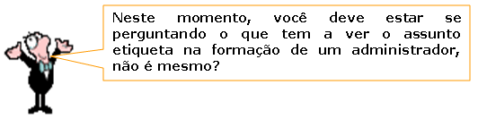 Se analisarmos o termo “etiqueta” pelo prisma da moda, do estilo, poderíamos até pensar que não teria, mas partindo do princípio de que o administrador moderno, empreendedor, deve percorrer diversos ambientes, é fundamental que ele aprenda a se conduzir nos mesmos, evitando, pois, alguns constrangimentos. Faz parte