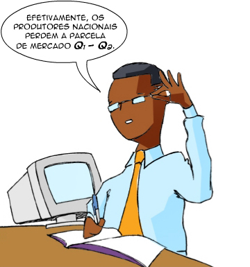 Após a implantação da região aduaneira, o novo equilíbrio de mercado dar-se-á no ponto C, em que se cruzam as curvas de demanda e de oferta do bloco comercial formado. O volume comercializado é dado por Q2–0, isto é, há uma expansão do mercado representada pelo intervalo Q2– Q1. Contudo, dada a concorrência de produtores localizados nos países que integram o bloco comercial, a produção interna se retrai, passando a ser representada pelo intervalo Q3–0.