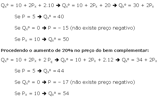 Por exemplo, seja: Qx0 = 10 + 2Px + 2Pc. Traça-se a curva de oferta Qx0 = f (Pc), considerando-se Pc=10 e o aumento no preço do bem complementar Pc de 20%.