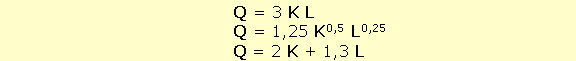 Supõe-se que todas as variáveis (Q, L, K) são expressas num fluxo no tempo; isto é, consideradas ao longo de um dado período de tempo (produção mensal, produção anual etc.). Supõe-se também que o nível tecnológico é dado ou determinado, tendo em vista ser questão pertinente à área de engenharia, que interessa à eficiência econômica. Como exemplo, há possíveis formas específicas de funções de produção, como: Cabe ressaltar que essas formulações da função de produção buscam medir a contribuição dos fatores de produção provenientes do estágio que estiver sendo analisado. Calcula-se o valor “acrescentado” ou “agregado” de produção criada nesse processo (Q). Portanto, não são contabilizadas as produções provenientes de estágios produtivos anteriores. |