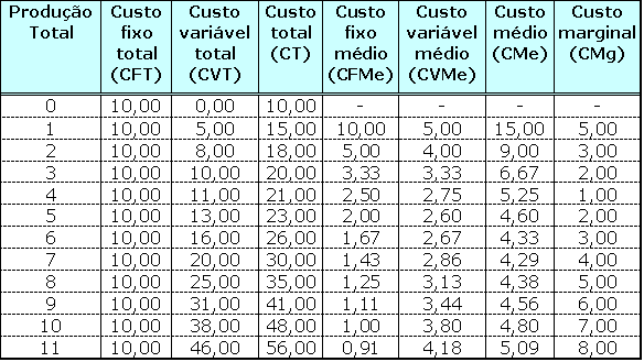 O custo marginal é um tipo especial de custo. Relaciona-se com o custo total de produção apenas em decorrência do comportamento do custo variável total. Todos os demais custos podem ser derivados dele. Observem o exemplo da Tabela nº 01.