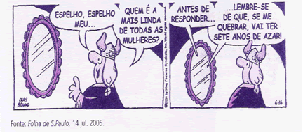de Neve, a madrasta má faz essa pergunta ao espelho. Na história da Branca de Neve, você se lembra o que o espelho respondeu? Ele dá a mesma reposta à madrasta? Não. A resposta dada foi: “A mais linda de todas as mulheres é Branca de Neve.” Por que, então, o espelho responde à Helga com essa advertência? Na resposta do espelho está o humor da tira. Ele adverte Helga porque não responderá o que ela quer ouvir e sabe que ela pode quebrá-lo por isso. Ou seja: Helga não é a mais linda de todas as mulheres. Espelho esperto, não? |