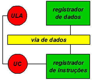 | A Unidade Central de Processamento é encarregada de gerenciar todo o tráfego de informações e também efetuar todo o processamento de dados. A peça principal da UCP (ou CPU) chama-se processador, que é composto de outros elementos: a unidade de controle - UC, a unidade de aritmética e lógica - ULA, o registrador de dados, o registrador de instruções e um barramento (bus). |