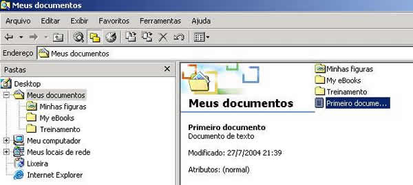 2 – Clique com o botão direito em um espaço em branco na janela da direita (janela de conteúdo). Aparecerá o menu contextual. 3 – Selecionar a opção Novo e, no novo menu que aparecer, clicar na opção documento de texto para criar um novo documento de texto. O documento será criado na pasta Meus documentos. 4 - Assim que ele aparecer, o nome do documento estará selecionado, escreva então o nome “Primeiro documento” e clique Enter. c) Copiando arquivos Para copiar, por exemplo, o arquivo Primeiro documento da pasta Treinamento para a pasta Meus Documentos, proceder da seguinte forma: 1 - Selecione o arquivo Primeiro documento no painel direito da janela, dando um clique sobre o mesmo. 2 - Clique no menu Editar e escolha Copiar 3 - Abrir a pasta Meus documentos, clicando sobre a mesma. 4 - Clicar novamente no menu Editar e escolher Colar 5- O arquivo Primeiro documento é copiado e exibido como: Conteúdo da pasta Meus documentos.