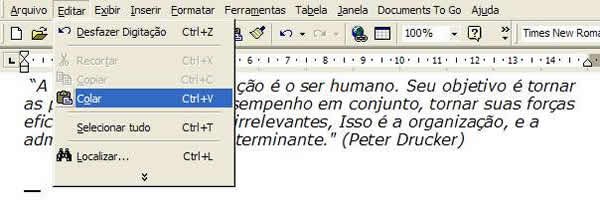 e) Copiando e colando Escreva o seguinte parágrafo: “A essência da administração é o ser humano. Seu objetivo é tornar as pessoas capazes do desempenho em conjunto, tornar suas forças eficazes e suas fraquezas irrelevantes, Isso é a organização, e a administração é o fator determinante." (Peter Drucker) Para efetuar uma cópia deste parágrafo, proceda como segue: 1- Selecione o parágrafo, clicando duas vezes à esquerda de qualquer linha desse parágrafo quando o ponteiro, ao ser levado para a esquerda, mudar para a forma de uma seta. 2 - Abra o menu Editar, clicando sobre ele, e escolha o comando Copiar.