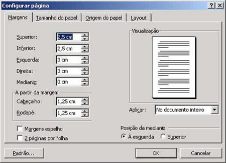 | 3 - Word: Formatando o documento Formatar um documento significa entre outras coisas alterar o tipo de letra, mudar o alinhamento do parágrafo, alterar as margens da folha e inserir quebras de páginas. a) Configurando a página 1- Clique sobre o menu Arquivo e escolha Configurar página. 2 - Na caixa de diálogo Configurar página, clique no guia Margens e verifique se as medidas estão de acordo com as dos padrões do Word.