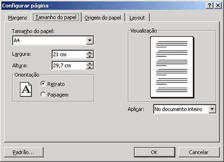 3 - Substitua as medidas que divergirem das apresentadas, clicando na caixa correspondente e digitando o novo valor ou se preferir, ajuste o valor clicando nas setinhas que aumentam ou diminuem o valor situado à direita da caixa. 4 - Na guia Tamanho do papel, abra a caixa de listagem de mesmo nome, clicando na seta ao lado e escolha o tipo A4 210 x 297 mm. No quadro Orientação, desta mesma guia, certifique-se de que a caixa de opção Retrato esteja selecionada.