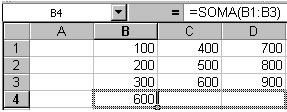 | b) Copiando fórmulas Para se obter a soma de mais outras duas colunas da planilha, pode-se copiar a fórmula da célula B4, como segue: 1 - Selecione a célula B4. 2 - Posicione o ponteiro do mouse sobre a alça de preenchimento do cursor de seleção, e quando o ponteiro mudar para a forma de sinal de +, pressione e, mantendo pressionado o botão do mouse, arraste o cursor de seleção para a célula D4 e, em seguida, libere o botão do mouse.