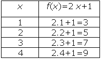 Considere f(x)=2x+1 onde o domínio de f(x) é A={1,2,3,4} e o contra-domínio é B = R. Para construir o gráfico de f(x) precisamos encontrar os valores do contra-domínio que estão associados com os elementos do domínio, esses elementos do contra-domínio recebem o nome de imagem de x por f(x). Costuma-se fazer uma tabela com os valores, como a seguir: