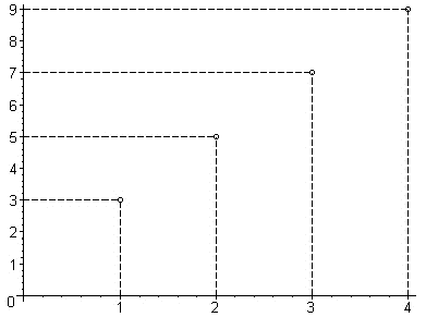 Em seguida traçamos retas cortando o eixo x verticalmente em 1, 2, 3 e 4 (os valores do domínio de f), o mesmo se faz no eixo y, só que agora serão retas horizontais em 3, 5, 7, 9 (as imagens dos elementos do domínio) quando a reta que passa pelo valor do domínio interceptar a reta que passa pela respectiva imagem obtemos um ponto do gráfico da função.