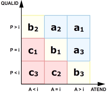 Como o valor para o cliente tem dois componentes, um tangível e um intangível, pode-se desenhá-lo num gráfico. No eixo vertical, vamos representar o valor tangível, a qualidade do produto. Ela pode ser maior, igual ou menor que a qualidade considerada internacional. No eixo horizontal, vamos representar o valor intangível, qualidade do atendimento. Ela pode ser maior, igual ou menor que o atendimento considerado de nível internacional.