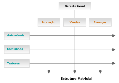Note que no alto do organograma estão as funções organizacionais já conhecidas de produção, vendas, finanças e assim por diante. Na dimensão vertical, no entanto, são acrescentados vários produtos ou projetos que a firma está realizando. Cada projeto é dirigido por um administrador que aloca pessoas de cada um dos departamentos funcionais. |