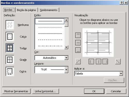 Estilo do quadro Linha, 4 - Clique sobre a guia Sombreamento. 5 - Na caixa Padrão do quadro Estilo, escolha 15%. 6 - Observe o efeito no quadro de Visualização situado na parte inferior à direita. 7 - Clique