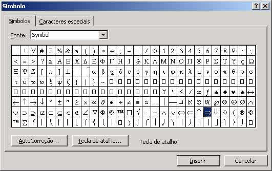 3 – Selecione o símbolo desejado e clique no botão Inserir. 4 – O símbolo escolhido será incluído no texto. Para fechar a janela clique em Cancelar. Os símbolos são tratados pelo Word como o restante das letras. Portanto, para alterar o tamanho, ou aplicar efeitos como negrito você deve utilizar a barra de formatação. |