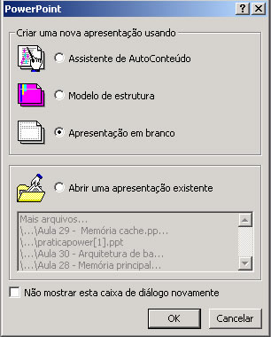 1 – utilizando o Assistente de AutoConteúdo: auxilia na montagem da apresentação. O Assistente de AutoConteúdo é uma abordagem orientada para a criação de uma apresentação. Ele pode ajudar a desenvolver suas idéias e a organizar a sua apresentação. Basta ir respondendo às perguntas exibidas na tela e alterar o conteúdo dos slides, conforme as informações sugeridas. 2 – utilizando Modelos: você pode escolher entre várias estruturas pré-definidas de slide desenvolvidas por designers profissionais. 3 - Apresentação em branco: você começa uma apresentação em branco. 4 – Abrindo uma apresentação existente. Neste módulo nós trabalharemos com uma apresentação em branco. Selecione a opção Apresentação em branco. |