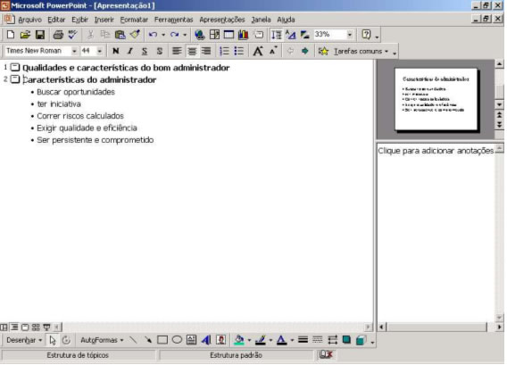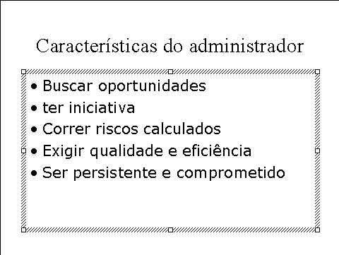 Adicionando texto ao corpo do slide 1 – Clique na caixa de texto e escreva: “Características do administrador” 2 - Clique na caixa de texto e escreva: “buscar oportunidades” 3 –