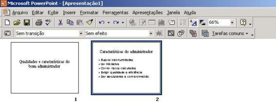 Adicionando texto à área de título do slide Clique na caixa de título e escreva: “Qualidades e características do bom administrador” c) Inserindo novo slide Para inserir um novo slide, você poderá escolher um dos seguintes passos: 1 - Acionar na Barra de Menus – Inserir / Novo slide 2 - Clicar na Barra Padrão (lado direito) no botão Novo slide 3 - Teclar Ctrl + M Aparecerá a caixa de diálogo Layout do slide e você seleciona a opção lista com marcadores, clique em OK.