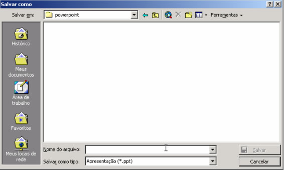f) Salvando o trabalho e fechando o PowerPoint Salve agora o seu trabalho. O procedimento é similar ao utilizado para salvar documentos no Word. Você pode fazê-lo, ativando no menu Arquivo a opção Salvar. Se o texto estiver sendo salvo pela primeira vez, o Word abrirá a caixa de diálogo Salvar, onde poderá ser informada a unidade de disco, a pasta ou diretório e o nome do arquivo.