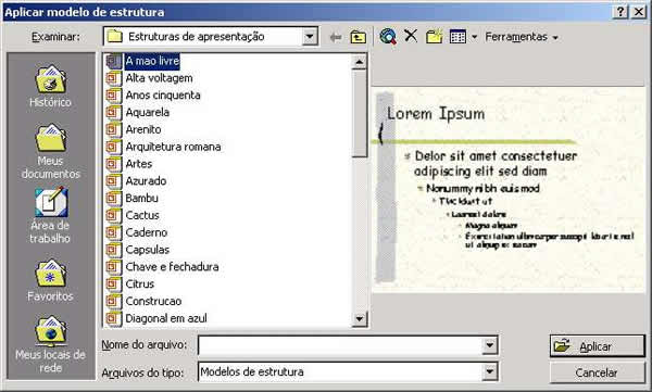 | d) Utilizando Modelos de estruturas Ainda podemos utilizar outros modelos de estruturas já preparadas, com a vantagem de já terem sido previamente testados no tocante à combinação de cores e fundos, bastando: 1 - Clicar no menu Formatar ou acionar no menu rápido o comando Aplicar Modelo de estrutura e selecionar uma dentre as muitas sugestões apresentadas. 2 - Selecione a sua opção e clique em Aplicar. DICA: Esta Estrutura de apresentação, escolhida desta forma, tornar-se-á válida para todos os slides da apresentação. |