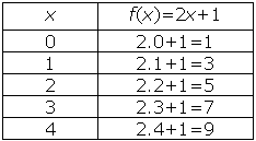 Considere f(x)=2x+1 onde o domínio de f(x) é A={1,2,3,4} e o contra-domínio é B = R. Para construir o gráfico de f(x) precisamos encontrar os valores do contra-domínio que estão associados com os elementos do domínio, esses elementos do contra-domínio recebem o nome de imagem de x por f(x). Costuma-se fazer uma tabela com os valores, como a seguir: