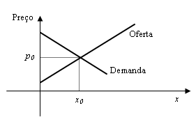 Entendidas as funções demanda e oferta, vamos explicar o conceito de ponto de equilíbrio de mercado...... O ponto de equilíbrio de mercado é o ponto de intersecção entre a curva de oferta e de demanda. Observe, no gráfico abaixo, que neste ponto os preços dados pelas funções, oferta e demanda, são iguais, assim como as quantidades ofertadas e demandas. Neste caso, haverá um preço e uma quantidade de equilíbrio. Observe que a função oferta é crescente, pois quanto maior o preço maior será a quantidade que ofertada pelo produtor. Já a função demanda é decrescente, pois quanto maior o preço menor será a quantidade procurada pelo consumidor.