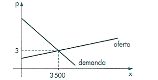 Assim, a quantidade de equilíbrio é x = 3500 unidades e o preço correspondente é obtido substituindo esta quantidade em uma das funções, oferta ou demanda. Logo, o preço de equilíbrio será: p = 10 - 0,002 . 3500 = R$ 3,00 Veja ilustração do problema no gráfico abaixo: