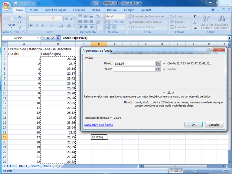 4 - Calculando a Moda e a Mediana Partindo agora para a determinação da moda e da mediana, a sequência inicial permanece, qual seja: selecionar uma célula na qual se deseja que a medida estatística apareça e posicionar o cursor, clicar em colar função, Estatística, MODO (no caso da moda) ou MED (no caso da mediana), OK , marcar ou digitar a posição da base de dados no campo ao lado de Num1, OK. Vejamos como fica.