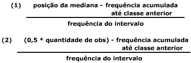 | 1- Determinação da Mediana de dados agrupados Para determinação da mediana, o primeiro passo é a sua localização, isso é, qual a posição central. Rigorosamente, haveria duas posições centrais, pelo fato de haver um número par de dados, porém, quando o conjunto de dados pode ser considerado suficientemente grande, é comum adotar, por aproximação, uma única posição central, dada pelo número de dados dividido por dois. Nesse caso: Posição