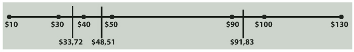 A partir desse critério só seriam passíveis de serem considerados pontos atípicos valores inferiores a -35,83 ou superiores a 156,54. Como tais valores não são encontrados na base de dados (que está compreendida entre R$ 10,00 e R$ 130,00), não há nenhum ponto discrepante no presente exemplo. |