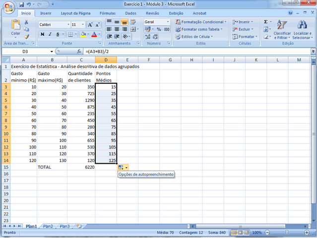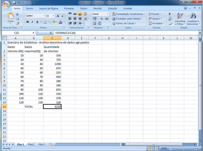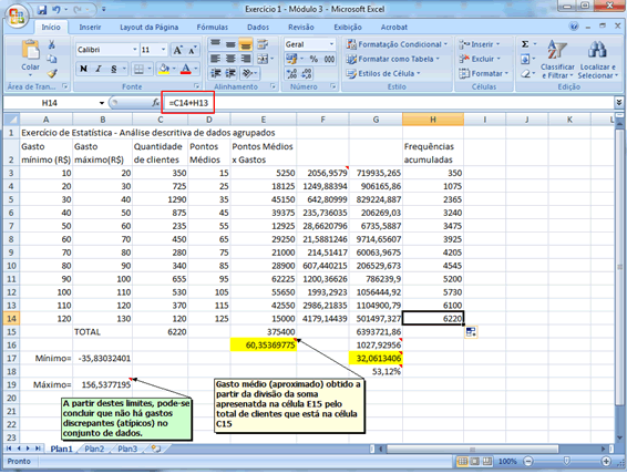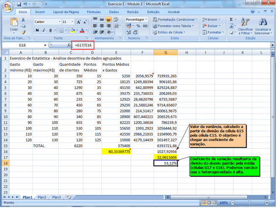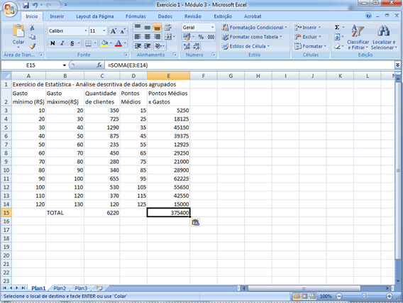 Resumo Neste módulo ilustrou-se o cálculo de várias medidas descritivas com o apoio da planilha eletrônica Microsoft Excel. A sequência de passos necessária para viabilizar é (lembrando que para dados agrupados não há soluções "automáticas", sendo necessário preparar a planilha da forma mais adequada e utilizar o conjunto de fórmulas trabalhadas naquele módulo): (a) abrir uma planilha e digitar a "tabela" de dados que será trabalhada, cuidando para que os limites inferiores de cada classe ocupem uma coluna, os superiores outra e as frequências uma terceira coluna; (b) criar uma quarta coluna na qual devem ser calculados os pontos médios de cada classe; (c) em uma quinta coluna calcular o produto dos pontos médios pelas respectivas frequências, já disponíveis em outras duas colunas (sempre iniciando a digitação por =); (d) selecionar uma célula na qual se deseja inserir a média e digitar a fórmula adequada iniciada pelo sinal =; (e) para o coeficiente de variação, inicialmente deve-se chegar ao desvio-padrão, o que se faz com o auxílio de mais duas colunas nas quais se desdobra a fórmula necessária para determinação da variância, após o que se calcula a raiz quadrada e divide-se pela média (em duas células selecionadas para isso); (f) para as separatrizes, incluindo quartis, decis e percentis, mais uma vez há utilização de duas colunas, uma para determinação das posições das separatrizes desejadas e outra para determinação dos seus valores. É conveniente