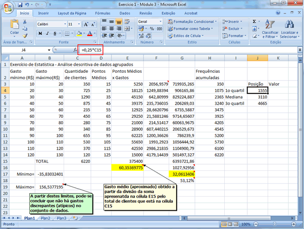 (para o primeiro quartil) ou Primeiramente serão determinadas as posições dos quartis nas células J4, J5 e J6, digitando =0,25*C15 (para o primeiro quartil), =0,5*C15 (para o segundo quartil, que é a mediana) e =0,75*C15 (para o terceiro quartil).